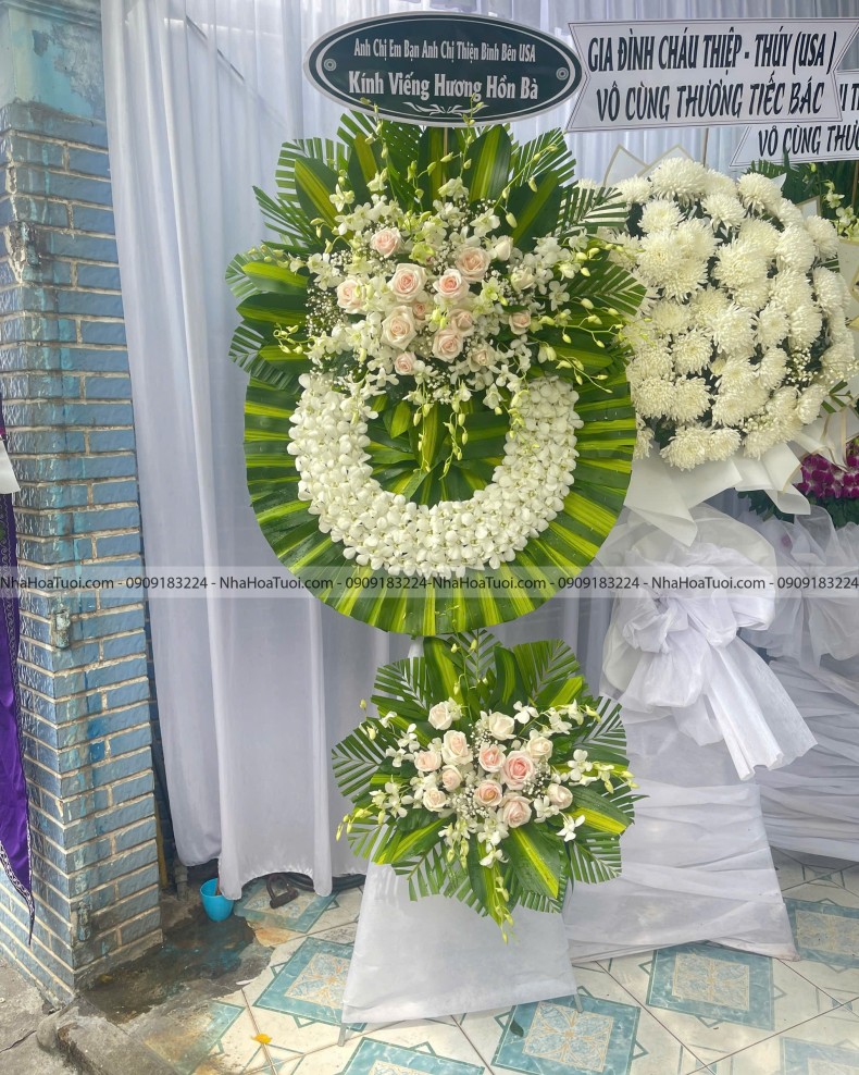 Thiết kế kệ hoa chia buồn 2 tầng hoành tráng kết hợp giữa lan Thái trắng và hồng kem, mang vẻ đẹp trang trọng để gửi lời phân ưu. Nhà Hoa Tươi hỗ trợ chuyển phát hoa nhanh chóng đến khu vực Phú Nhuận, Bình Thạnh và tất cả các quận huyện khác.