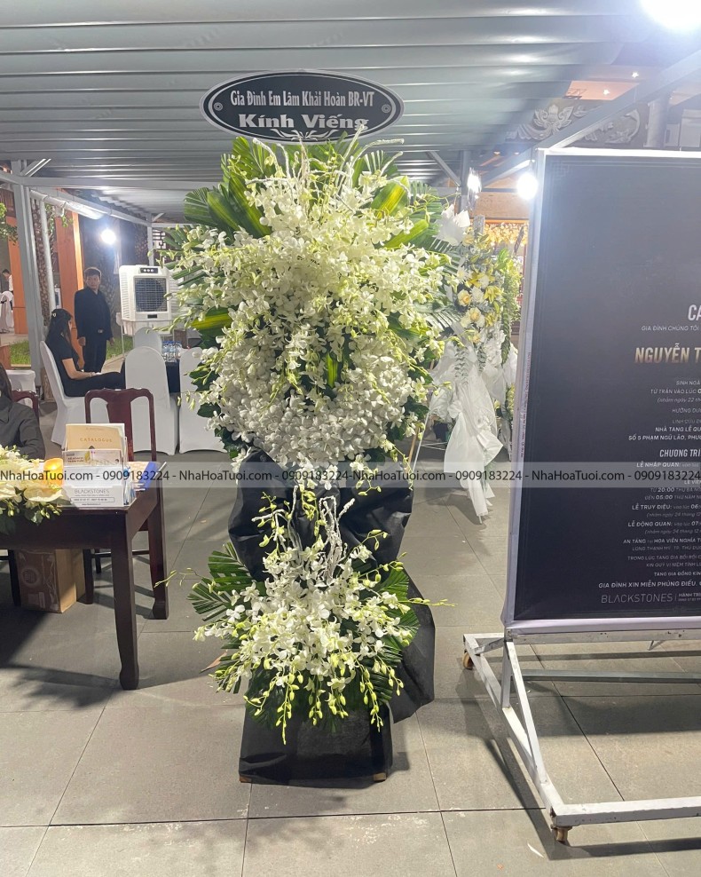Kệ hoa chia buồn thiết kế riêng cho quy mô gia đình với sắc lan Thái trắng tinh khôi, mang thông điệp tiễn biệt sâu sắc và nhẹ nhàng. Chúng tôi cung cấp dịch vụ giao hoa tận tâm tại khu vực Bình Tân, Tân Bình và khắp các quận huyện tại TP.HCM.