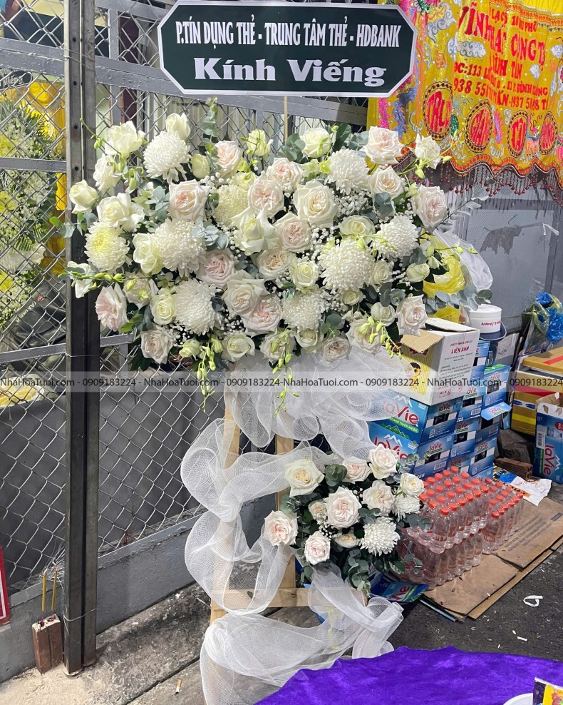 Sự kết hợp tinh tế giữa lan Thái, cúc mẫu đơn và các loại hồng trắng, hồng kem mang đến phong cách chia buồn hiện đại, sang trọng. Chúng tôi hỗ trợ giao hoa tận tâm, hỏa tốc tại khu vực Tân Phú, Hóc Môn và phục vụ chu đáo trên toàn địa bàn TP.HCM.