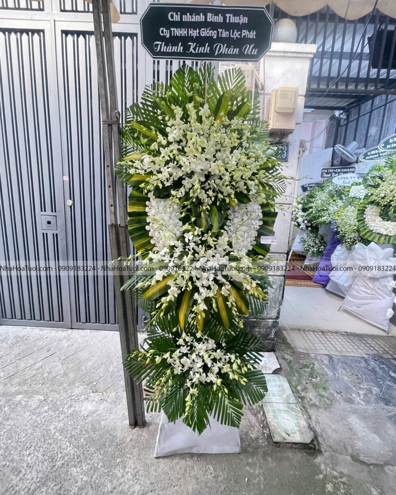 Thiết kế kệ hoa tang lễ 2 tầng dành riêng cho thông gia kính viếng, sử dụng lan Thái trắng cao cấp để thể hiện sự trân trọng và gắn kết giữa hai gia đình. Nhà Hoa Tươi hỗ trợ giao hoa hỏa tốc tận nhà riêng hoặc nhà tang lễ tại Phú Nhuận, Bình Thạnh và toàn TP.HCM.