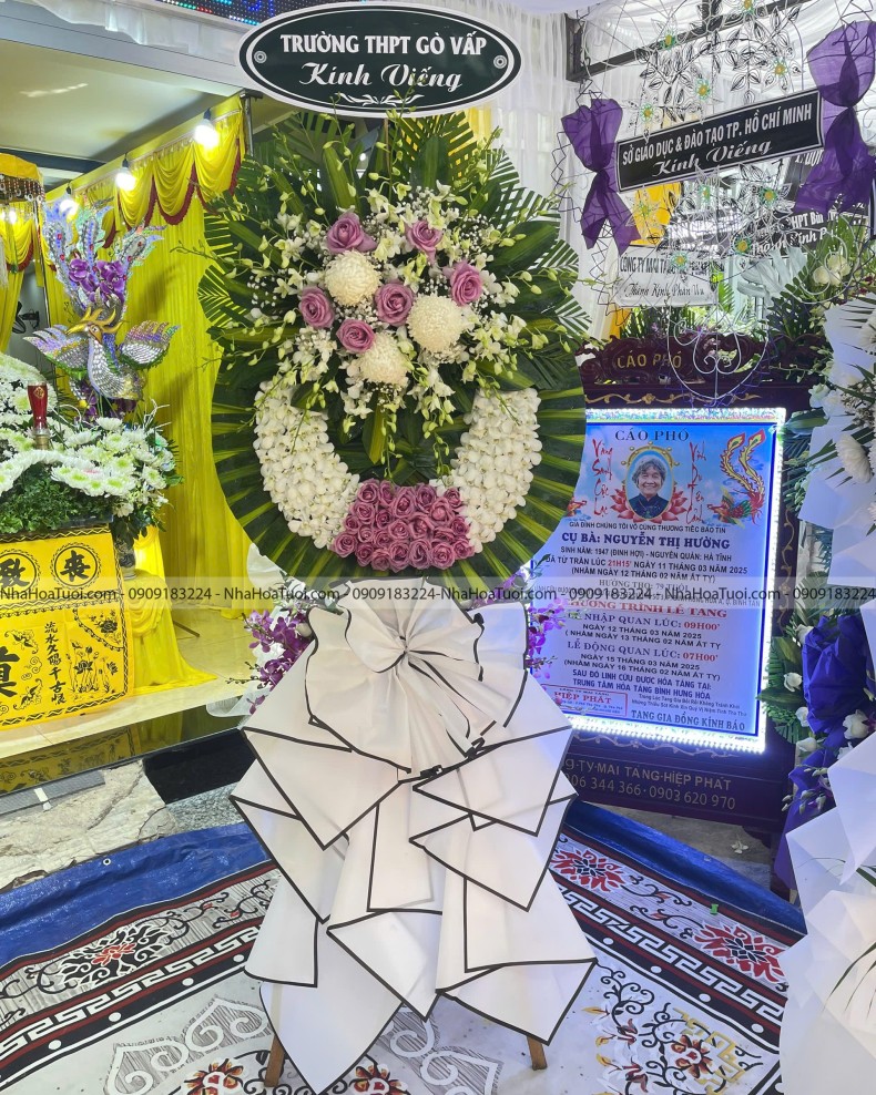 Kệ hoa tang lễ 2 tầng với thông điệp "Vô cùng thương tiếc", kết hợp giữa lan Thái trắng và hồng tím trang nhã, gửi gắm nỗi buồn và lòng thành kính sâu sắc. Chúng tôi chuyên cung cấp điện hoa hỏa tốc tại khu vực Hóc Môn, Bình Tân và giao hoa tận tâm trên toàn TP.HCM.