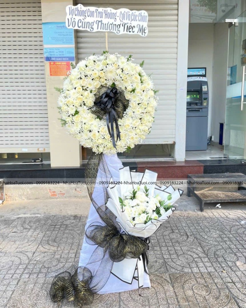 Kệ hoa viếng hiện đại 2 tầng là sự kết hợp tinh tế giữa hoa cúc lưới bền bỉ và những đóa hồng trắng sang trọng, tạo nên lẵng hoa chia buồn đầy thành kính. Nhà Hoa Tươi hỗ trợ giao hoa hỏa tốc chuyên nghiệp tại khu vực Tân Phú, Hóc Môn và phục vụ chu đáo trên toàn địa bàn TP.HCM.