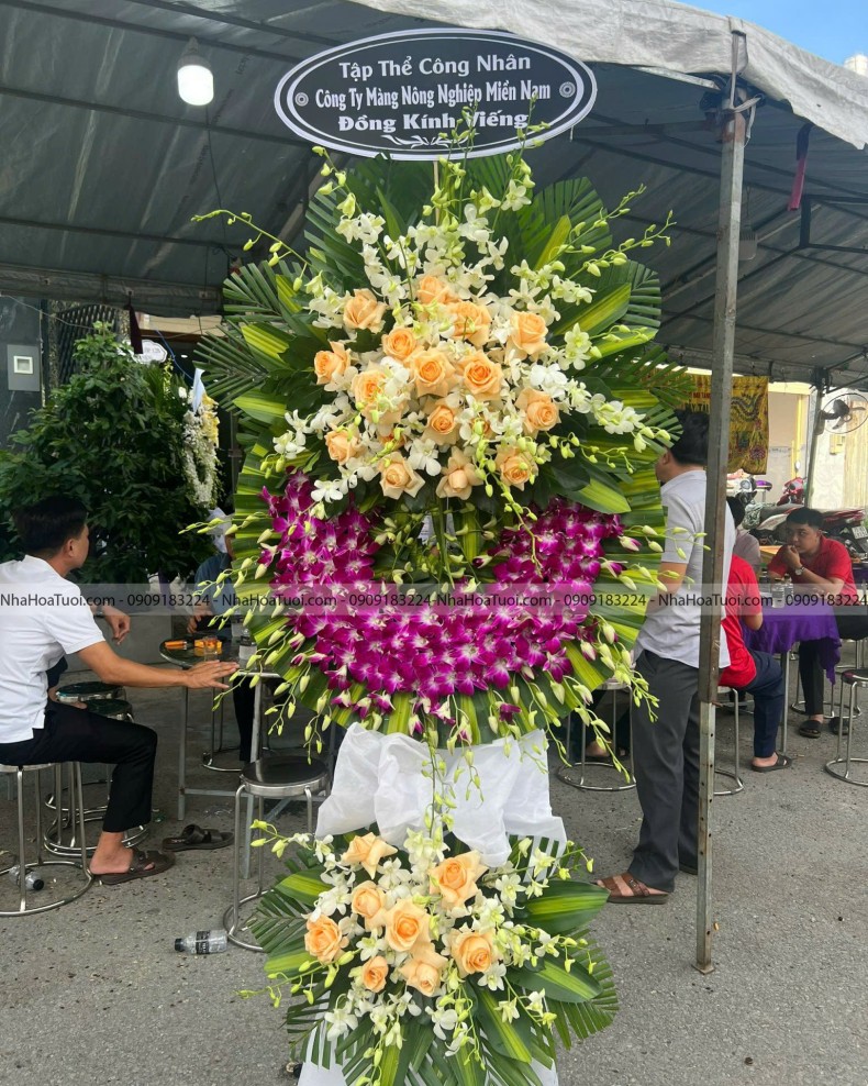 Mẫu lẵng hoa viếng 2 tầng phối hợp độc đáo giữa lan Thái trắng tím và hoa hồng hột gà mang tone màu ấm áp, thể hiện sự tiễn đưa nhẹ nhàng và thành kính. Nhà Hoa Tươi hỗ trợ giao hoa hỏa tốc tận tâm tại khu vực Bình Tân, Tân Bình và phục vụ chu đáo trên toàn địa bàn TP.HCM.
