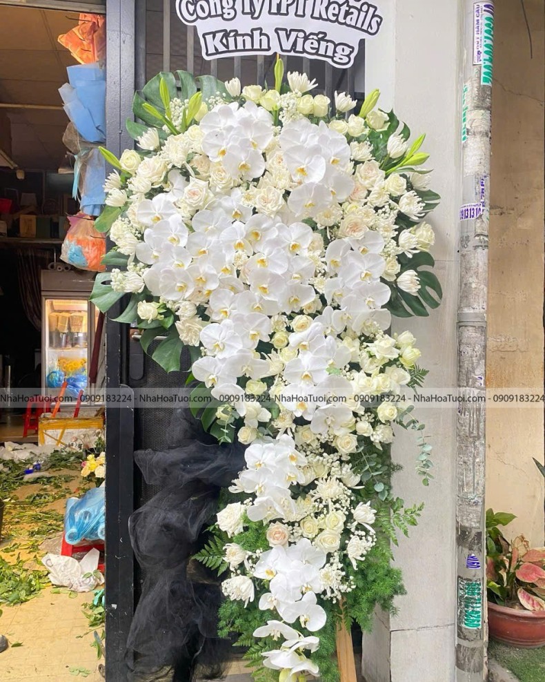 Thiết kế vòng hoa viếng đẹp dành riêng cho doanh nghiệp với kiểu dáng trang trọng, thay lời chia buồn sâu sắc và khẳng định vị thế của công ty. Nhà Hoa Tươi hỗ trợ giao hoa tận nơi chu đáo tại khu vực Gò Vấp, Tân Phú và phục vụ chuyên nghiệp trên toàn TP.HCM.