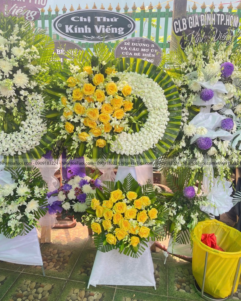 Mẫu vòng hoa viếng đẹp tone vàng rực rỡ từ sự kết hợp giữa lan Thái trắng và hồng vàng, mang ý nghĩa về sự tôn kính và cầu nguyện bình an. Chúng tôi hỗ trợ giao hoa hỏa tốc tận nơi tại Phú Nhuận, Bình Thạnh và tất cả các quận huyện khác tại TP.HCM.